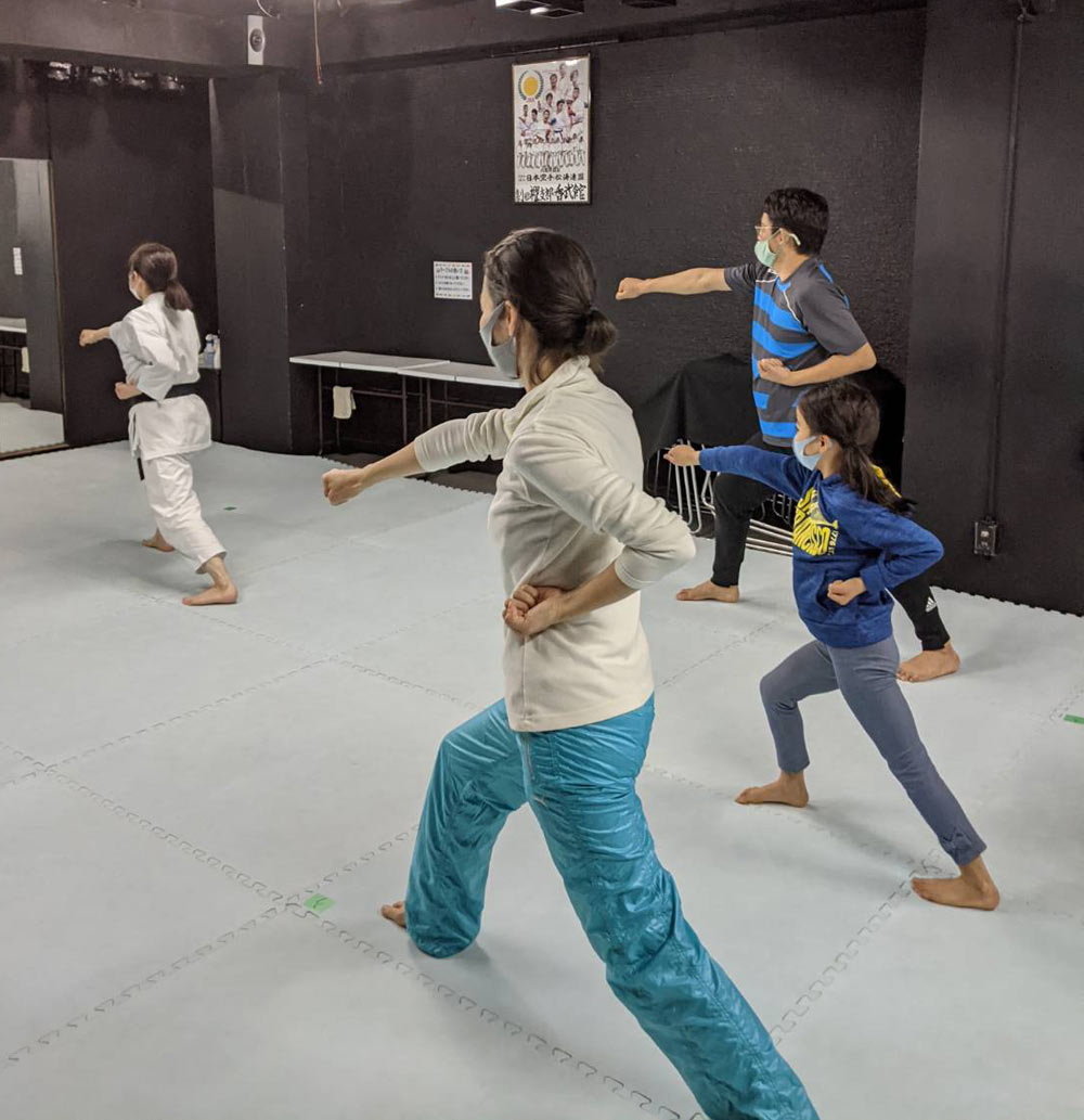 基本の突き、蹴りの稽古の後は移動しながらの突き、蹴りも。皆さん初めてとは思えない中段突きです。